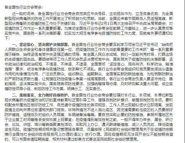 意見指出,各全國性行業(yè)協(xié)會商會要加強對本行業(yè)、本領域、本單位新型冠狀病毒肺炎疫情防治知識的宣傳教育和正面引導工作,增強自我防護意識,掌握自我防范本領。在疫情得到有效控制之前,一般不得舉辦年會、展會、研討會、論壇、講座、培訓等各類聚集性活動,采取網上辦公、通訊聯(lián)絡等措施,減少人員流動,降低疫情發(fā)生風險。疫情防控期間相關登記管理服務事項,盡量按照《民政部社會組織管理局關于在疫情防控期推行全國性社會組織政務服務網上辦理的倡議》進行辦理。因在疫情期間無法召開會議不能按期換屆的,可以書面申請延期換屆。