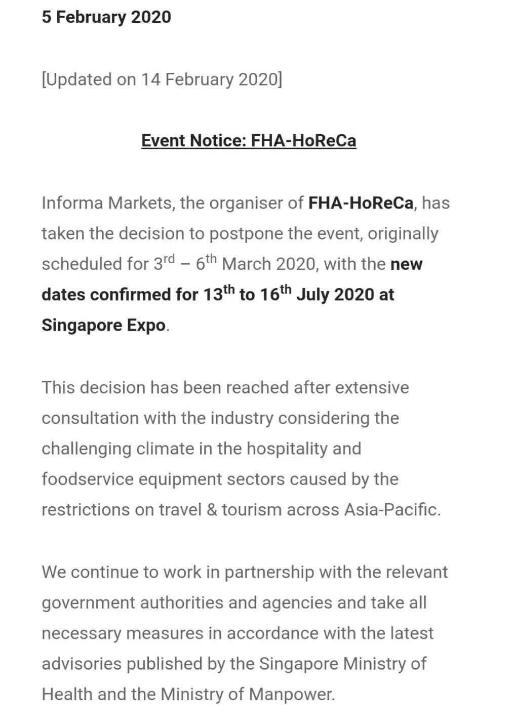 在新加坡展覽中心舉辦的每兩年一屆的新加坡亞洲國際食品與酒店展FHA將日期推遲。FHA-HoReCa原計劃于3月3-6日舉辦,日期修改為7月13-16日;原計劃于3月31至4月3日舉辦的FHA-Food&Beverage日期延后,具體安排另行通知。